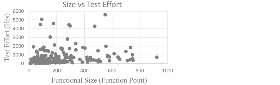 The scatter diagram in Figure 1 depicts a large dispersion between functional size and test effort, the independent and dependent variables, respectively. The pattern is closer to wedge-shaped and is typical of data from large repositories [10] .
