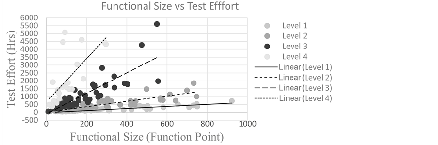 Within the dataset of Figure 1, there are candidate groups exhibiting both large economies of scale and large diseconomies of scale. The rate of increase of test effort is not the same for all similar functional sizes. Analyzing various slices of data brought out different testing productivity levels (Figure 2).