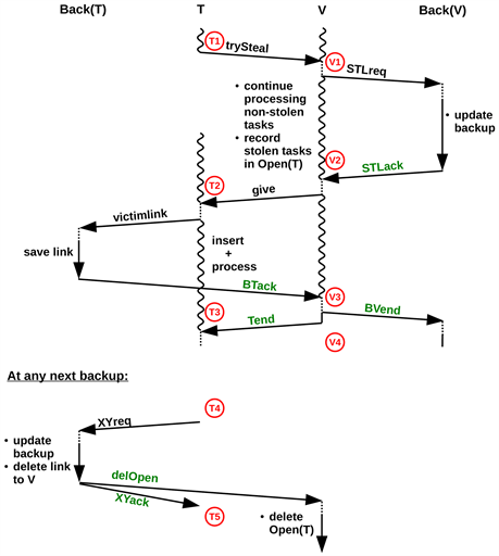 6) Steal Protocol: The steal protocol is depicted in Figure 2. For clarity, only a single thief T and victim V are shown, but there may be several thieves. Dotted lines denote waiting times for Runtime.probe(), and wavy lines mark task processing (depicted at T and V only). Messages STLreq, STLack and BVend are sent once per transaction, whereas the other messages are sent once per thief.