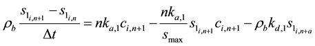 Many types of reaction sites exist, and thus there are many models that describe the mass transfer between the solid and liquid phases. MNM1D takes into account two reaction sites. The first is assumed to have blocking phenomena, and so the colloid concentration at the site is limited to a fixed values