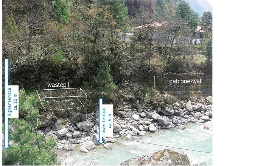Figure 7. View towards orographic left bank of Dudh Kosi river close to Phakding in April 2013: waste pit in the lower terrace. Constructed gabione-wall shows high susceptibility to erosion even of higher river terrace.
