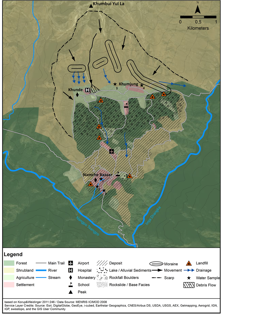 tory and analyzed since this is still the best method to find typical microstructures and to verify paleo-landslide- processes [26] . Furthermore, locations and installations of landfill sites were mapped and analyzed in combination with the results from the geological-geomorphological analysis. Water samples collected at springs and fountains in Namche Bazaar and Khumjung provided insights to water quality in the region and spatial distribution of aquifers. A Sera test kit was used to measure nitrate and phosphate concentrations. Field work campaigns were carried out in 2007 (March and April), 2011 (July and August) and 2013 (April and May). All relevant information was digitalized and analyzed in a geographic information system (GIS).