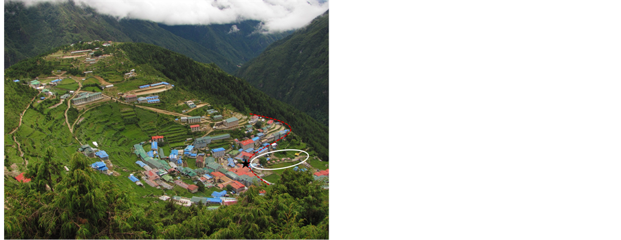 The study area, which was limited to the section between Lukla, Namche Bazaar and Khumjung, is situated within the SNPBZ in the northeastern district Solu-Khumbu in Nepal (Figure 1). Lukla is the gateway to the Everest region because it is connected by regular air service. There are several lodges and tourist facilities. Namche Bazaar is the main economic and touristic center of the region and the gateway to various basecamps and mountain peaks. Namche Bazaar has prospered immensely from the tourist trade and belongs to one of the wealthiest villages in Nepal, although it is physically isolated by mountainous terrain [17] [27] . The traditional farming villages Khumjung, Syangboche and Khunde are situated above Namche Bazaar.