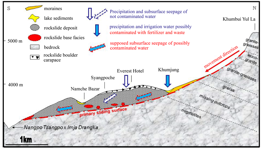 Figure 10. Geologic long-section of Khumjung rockslide (after [14] ): supposed subsurface way of seepage of possibly not contaminated and contaminated waters due to organic and chemical fertilizer as well as open waste pits. Remarks: precipitation water dropping down on the rockslide’s surface in between Khumjung and Namche Bazaar and seepaging through rockslide material may not necessarily contain high phosphate and/or nitrate as this water bypasses the Khumjung-Khunde agricultural area (compare Table 1, No. 4 and 5).