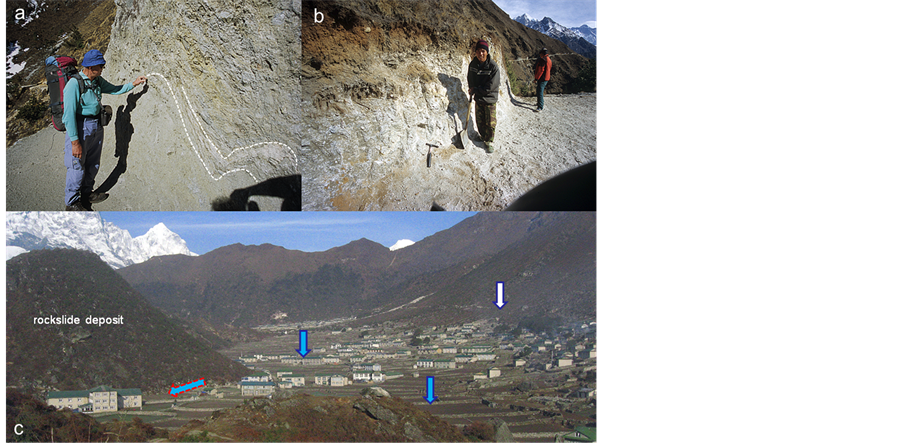 Figure 11. Khumjung rockslide deposit: typical “schlieren-like” deformation of primary rock structure in base facies (a), almost mechanically pulverized material, easily erodible for path workers along main trail to Tengpoche, Imja Drangka valley upwards (b), both positions: 1 km east of Everest View Hotel (3600 m a.s.l.); Khumjung and Khunde (in the background) villages―main points of possible water infiltration (colour of arrows see Figure 10).