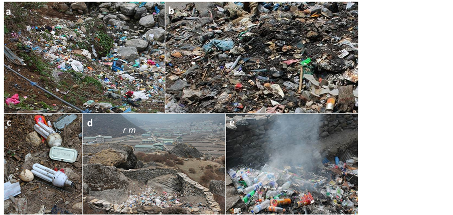 The generation of solid waste due to the high import of packaged consumer goods is one of the major environmental issues in mountain areas with high concentrations of tourism [22] . As the number of tourists increases each year, so does the accumulation of rubbish [1] [2] . The increasing amount of solid waste produced by trekking tourists, mountaineering groups and local shop and lodge owners not only diminishes the attractiveness of the region, but also poses a significant environmental threat to the fragile ecosystem and human health. The consequences include air, soil and water pollution through improper storage and disposal [1] [17] [23] . Solid waste ranges from food packages, wrappers, bottles, glass and metals to hazardous waste items such as batteries, medical supplies and light bulbs. All of these materials accumulate quickly and pose serious disposal problems [23] [24] .