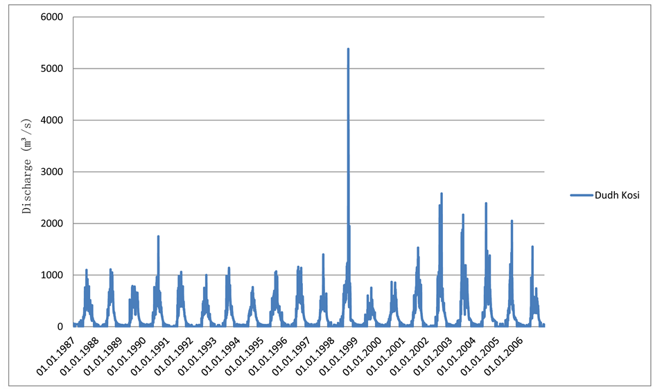 Figure 2. Discharge of Dudh Kosi at Rabuwar-Bazaar, which is located 47 km south of Lukla and includes major tributaries like the Inkhu Khola and the Hongu Khola. Respective conjunctions are also south of Lukla. Within the subcatchment of Inkhu Khola the Tam Pokhari GLOF, which did not impact our study area, occurred 03-08 September 1998 which started with a peak discharge of about 10,000 m3/s [62] (Station: 670; Lattitude: 271600; Longitude: 863950; Source: Department of Hydrology and Meteorology, Nepal).