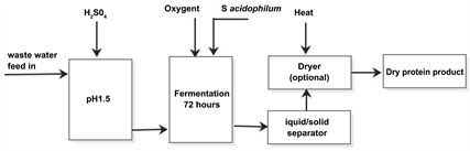 Based on the present research the process would compose of pre-treatment, including a pH adjustment and hydrolysis with sulphuric acid (Figure 1). This would be followed by non-aseptic cultivation of S. adicophilum under aeration for 72 h. The produced biomass is dehydrated with solid-liquid separation and drying. Based on the present and previously published research, efficient aeration is a prerequisite of the SCP production by S. acidophilum [13] [16] . As has been suggested, the most economical choice for the plant would be similar as in the active sludge process [11] . In case of S. acidophilum the final biomass concentration would be relatively low, namely in the range of 5% - 9% dry matter [13] [16] , while the final product should contain 10% or less moisture. This means that the harvesting and dehydrating are significant contributors to the production cost. The solid liquid separation for filamentous fungi is usually most feasibly prepared with filtration, after which the biomass is dried to maintain its quality [26] .