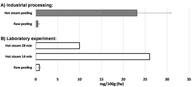 These results suggest that decreased concentration of chlorogenic acid in the raw peeled PPW may be caused e.g. by enzymatic degradation processes which seems to be activated during raw peeling methods, whereas short exposure to hot steam eliminates that activity. Extended hot steam exposure to high temperatures obviously also causes degradation of chlorogenic acid. Shorter exposure to the hot steam in laboratory experiments successfully mimic the industrial hot steam peeling process where potato is not fully cooked and hence chlorogenic