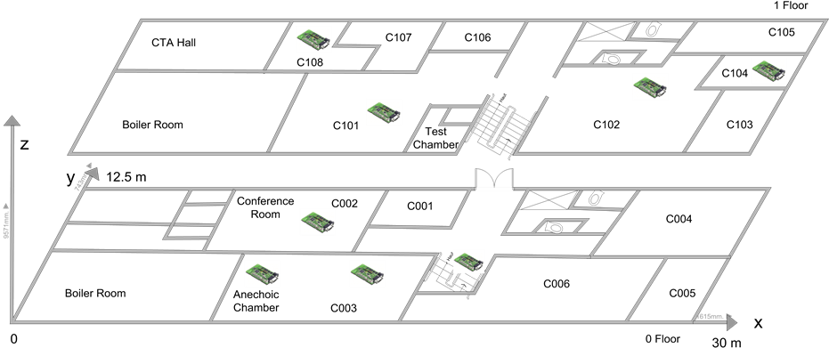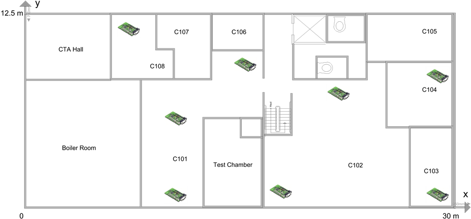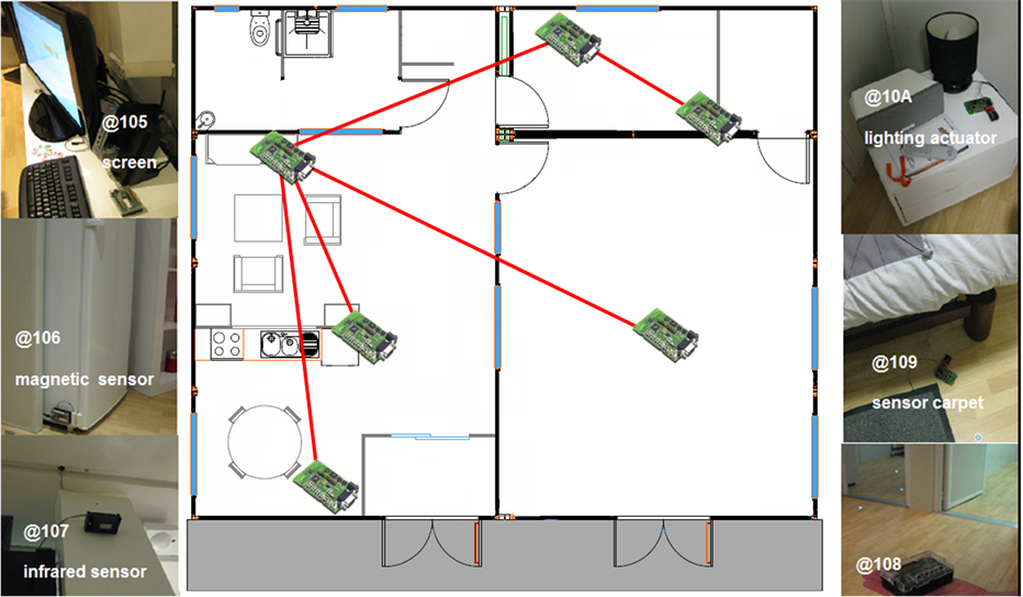 Six ADCF nodes were deployed in the smart home. From MAC point of view, these 6 nodes form a full mesh network. The nodes are connected with various sensors corresponding to the target of our application: