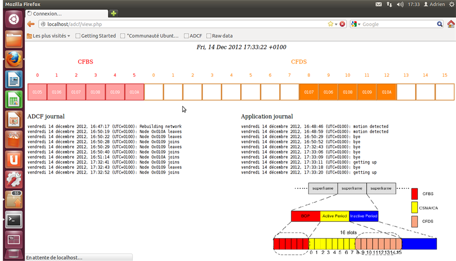 Figure 7 shows a result of the above network deployment. From the ADCF journal and application journal displayed on the screen, we can see that each node can join or leave the network freely and the rest of the network works properly. Generally, the network rebuilding time is less than 10 s. At this moment, 6 nodes occupy 6 CFBS as they are all 1-hop neighbours. 5 CFDS are negotiated to transmit the corresponding application data. Thanks to a buzzer available on the nodes, which is activated for each data frame reception, we can verify that the bounded time is verified as expected. For example, end-to-end delay is always less than 2 s when the superframe is fixed as 1.5 s. It satisfies our application requirements. In addition, the superframe with its slot allocation is totally consistent with what we proposed in Section 3.