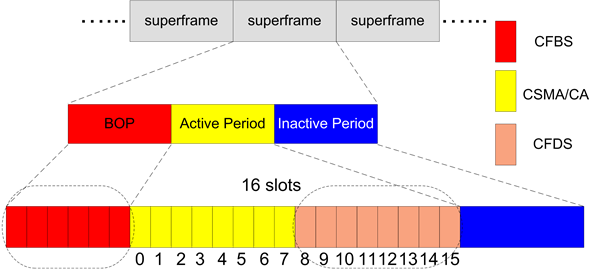 Generally, the nodes can switch between two stages: initialization stage and working stage. In initialization stage, which is not using the superframe structure, the nodes access medium by unslotted CSMA/CA mechanism. In working stage, the time is divided into superframe and each superframe includes three parts: {BOP, Active Period, Inactive Period}.