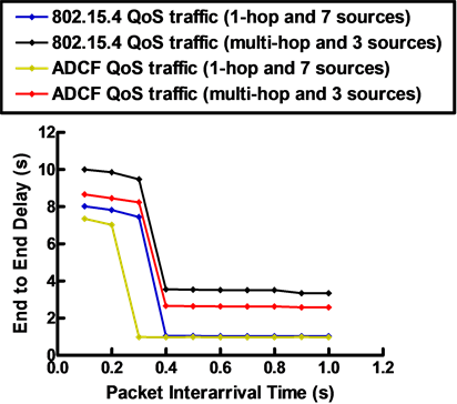 As shown in Figure 3, there are 7 sources with 1-hop traffic or 3 sources with multi-hop traffic. When Packet Interarrival Time decreases from 1.0 s to 0.1 s, the traffic load will increase. Therefore, End-to-end delay becomes larger. When Packet Interarrival Time is about 0.4 s, there are radical changes caused by buffer overflow.