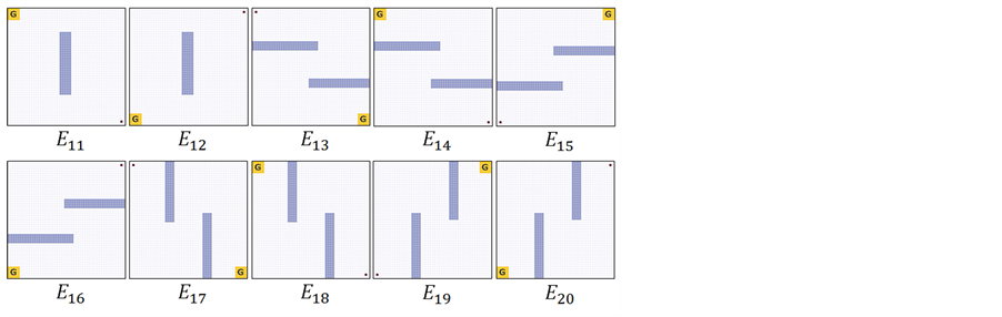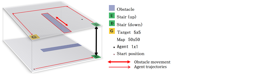 The types of state and action are shown in Table 1 and Table 2, respectively. Table 1 shows the output actions of an agent in 8 directions and Table 2 shows 256 types of the total input states coming from the combination of existing obstacles in 8 directions. The 8 directions are the top left, top, top right, left, right, bottom left, bottom, and bottom right. The agent has 2048 (8 actions × 512 states) rules in total that result from a combination of input states and output actions in a layer. The size of agent, target, and environment are 1 × 1, 5 × 5, and 50 × 50, respectively.