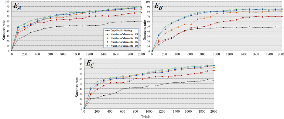 Even the success rate by using only 15 elements is also higher than that using only the profit-sharing method, but is still lower compared to the results using 25 and 35 elements. Hence, we can say by reducing the number of elements too much, the influence on policy improvement is apparent in all environments. However, although