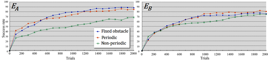 Figure 8 shows that the success rate in the case of periodic dynamic movement was almost no difference in the early period compared with the fixed obstacle case in both