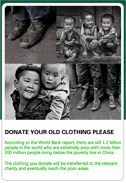According to the World Bank report, there are still 1.2 billion people in the world who are extremely poor, with more than 200 million people living below the poverty line in China. Old clothing can be distributed to the poor in remote areas to alleviate the problem of dressing, as well as be recycled for production reuse. Encouraging clothing recycling behaviors is an effective way to help the poor supplement the source of clothing, and is also necessary for building a conservation-oriented society and promoting sustainable development.