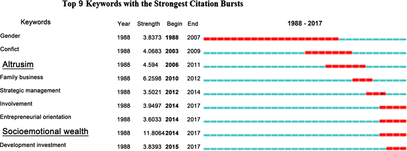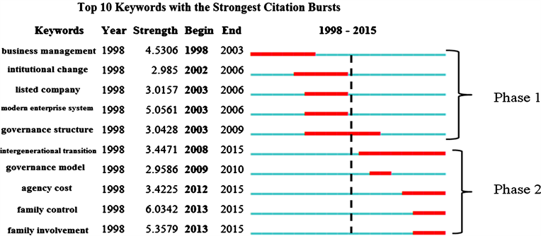 The hot keywords “family involvement” and “family control,” which began in 2013, are the latest burst terms. “Family control” is not only the last, but also the strongest burst term. It clearly shows the respect for authority in Chinese family firms, under the influence of the unique Chinese family culture. However, such control can also cause prominent problems in enterprise R&D, performance, and succession [43] [44] . In addition, the characteristic of differential sequence pattern [45] in Chinese social relationships leads to the focus of makes Chinese scholars on family authority.