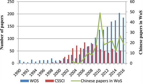 Figure 1. Temporal distribution of literature from the Chinese Social Sciences Citation Index (CSSCI) and Web of Science (WoS) databases.