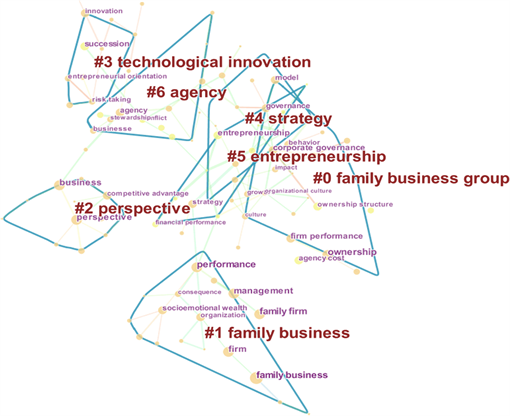 representing hot research topics about family firms. The specific results are shown in Table 1. In terms of size, the seven clusters all cover at least 10 nodes, with S values5 larger than 0.778, reflecting reasonable clustering and clear-cut themes. From these clustering results, hot research topics about family firms include governance of family firm groups, a definition of family firms, relevant research approaches, and family visions, as well as technological innovation, strategic decision-making, entrepreneurship, and family firm agencies. In combination with these clustering results and intercluster relationships, we summarizes and discusses the following hot research topics about family firms in other countries:
