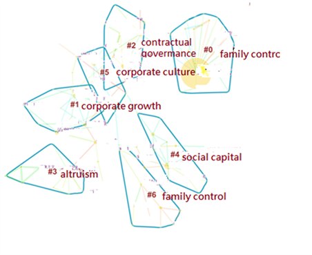 Family firm groups and family firms. Cluster 0 and Cluster 1 are discussed together, mainly including subclusters such as corporate governance, control, and firm performance. Family firms in WoS have a long history. One characteristic that distinguishes family firms between western developed countries and China is the establishment of family councils. Family councils can lead family firm groups and family funds, specify the duties of family members, achieve a smooth succession of family firms, and maintain harmony within families [9] . This not only guarantees ownership and control by family members [10] [11] and continuity of family interests, but also enables family firms to meet the challenges of various risks and opportunities through diversified development.