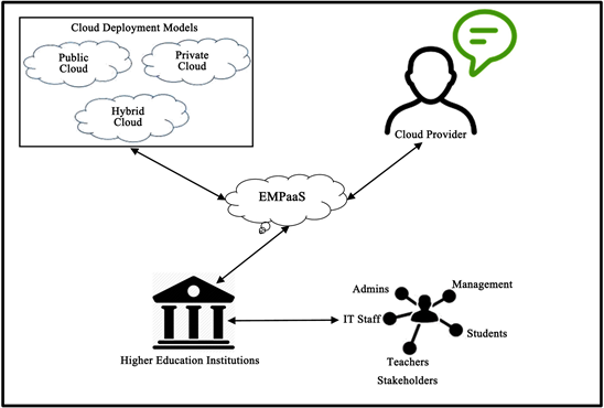 Figure 2. EMPaaS solution for HE to improve monitoring and progression processes, in addition to educational practices, such as teaching, research and course management.