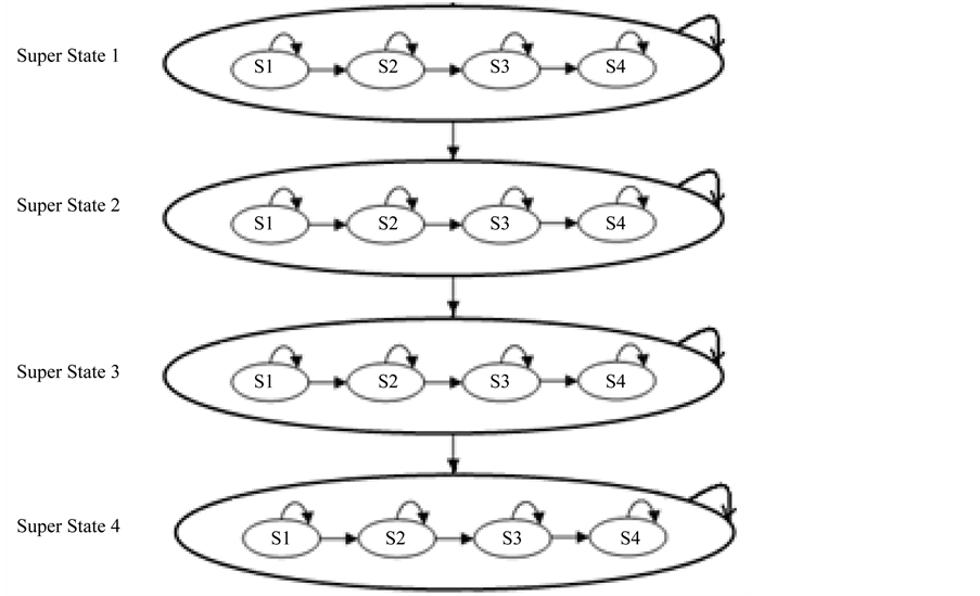 A NHMM [30] can be described with state transition probability matrix T, an initial state probability distribution π, and the emission probability associated with the observations for each state. A NHMM is defined as λ = [π, T, E]. In general, the transition between the states depends upon transition probability and emission probability. One dimensional NHMM structure (Figure 2) is suitable for analyzing 1-D random signals like speech signals. The NHMM structure (as shown in Figure 3) is developed from one dimensional HMM in which s1, s2, s3 and s4 specifies sub states of each feature like eyes, nose, mouth and chin respectively. Each super state indicates the every subject and the number of super states raises if number of subject is increased.