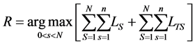 The maximum likelihood of test image LTS and maximum likelihood of input image, LS likelihood probability of training images is taken to calculate the matching score, R, in Equation (13) as follows: