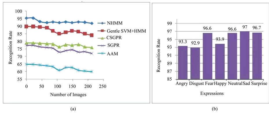 The comparison of proposed work recognition rate with existing methods according to the expressions is shown in Table 4. The recognition rate is depicted in a graph (Figure 9(b)) according to the expressions. The proposed work produced the highest recognition rate when compared to existing methods like Active Appearance Model [31] , Scaled Gaussian Process Regression (SGPR) [8] , Coupled SGPR (CSGPR) [4] and the combination of SVM [32] and HM [16] .
