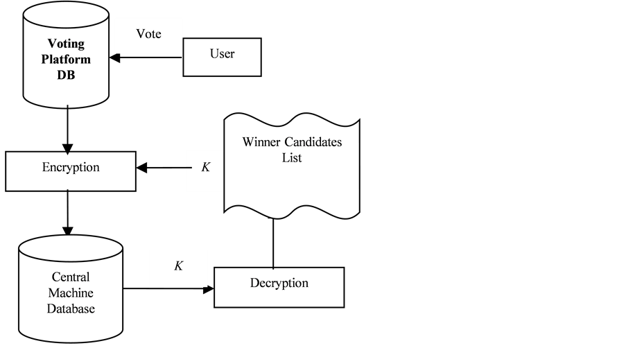 In the existing voting System (shown in Figure 2) Symmetric key encryption scheme using a private key (K). The Database which receives the voting interface data used the Key K for encryption. It is less secure than our system. The length and strength of the Cryptography keys are considered important. The keys used for encryption and decryption must be strong enough to produce strong encryption. They must be protected from unauthorized users and must be available when they are needed [14] .
