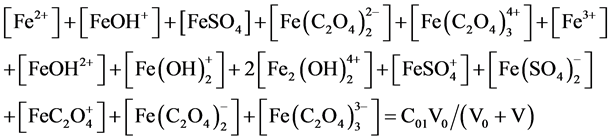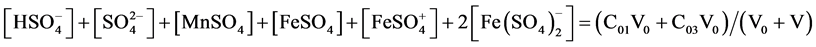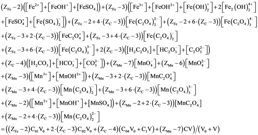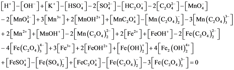The equation for charge balance (Equation (7)) and equations for concentration balances for Fe (Equation (8)), Mn (Equation (9)), C (Equation 10) and SO4 (Equation (11)), and K (Equation (12)) are as follows: