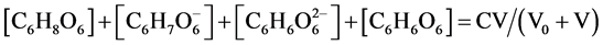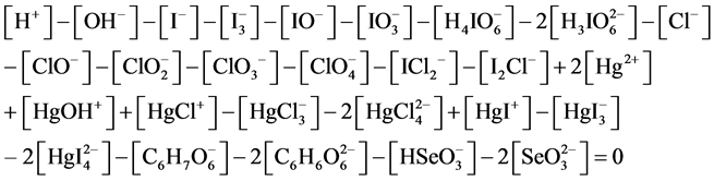 Example 13. V0 mL of D containing KIO3 (C0), HCl (C01), H2SeO3 (C02) and HgCl2 (C03) is titrated with V mL of ascorbic acid C6H8O6 (C). Within defined volume interval of ascorbic acid solution added, solid iodine, I2 (solubility s = 1.33 ´ 10−3 mol/L at 20˚C) is formed. We have there P = 46 species: H2O, H+, OH−, e−, K+, C6H8O6,