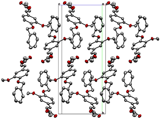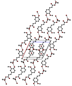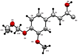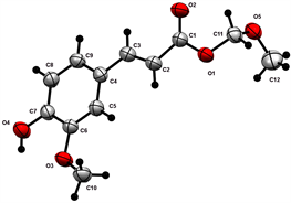 Figure 8 shows the molecular structure of 3. Bond lengths and angles are similar to those found in 3-(4-Hydroxy-3-methoxyphenyl)-2-propenoic acid (FA) [24] . The dihedral angles between the side chain at C4, the acrylate and the phenyl ring are 48.31 (5) and 9.32 (5)˚, respectively. The molecular packing of 3 in the crystal shows an intermolecular O-H…O hydrogen-bonded carboxylic acid dimers that together with several C-H…O interactions form a sheet-like structure (Figure 9).