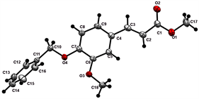 The molecular structure of 7 is shown in Figure 8. The molecule contains three substituents mainly at C4 an acrylic acid group; at C6, a methoxy group and at C7 a benzoyloxy moiety. The dihedral angles between phenyl ring C12-C17; the linker C7-O4-C11-C12 and acrylic acid group at C4 with the central phenyl ring C4-C9 are 74.62 (6), 12.17 (9) and 7.37 (5)˚, respectively. There is one intermolecular hydrogen bond O-H…O with a symmetry related molecule (+2 − x, +2 − y, +2 − z) forming sheets along the b-axis and two C-H…O interactions linked the molecules in the crystal and packed at normal van der Waals distances (Figure 9).