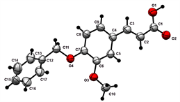 There is an intramolecular hydrogen bond and one intermolecular hydrogen bond between the hydroxyl group at C7 and O5 with a symmetry-related molecule forming sheets along the a-axis. In structure 3, the bond lengths and angles are similar to those found in 3-(4-Hydroxy-3-methoxyphenyl)-2-propenoic acid (ferulic acid). Molecular packing of molecules in the crystal shows an intermolecular O-H…O hydrogen-bonded carboxylic acid dimers that together with several C-H…O interactions form a sheet-like structure. In structure 4 is a new benzoyloxy and acrylate derivative of FA. The molecules in the crystal are linked by one C-H…O intermolecular interaction involving H atom of the phenyl ring C4-C9 and carbonyl oxygen of the acrylate group. This interaction links crystal and packed molecules at normal van der Waals distances. In structure 6, there are two independent molecules in the crystal. Structure 6 contains three substituents mainly at C4 a methoxyphenylacrylate moiety; at C6 a methoxy group and C7 a benzoyloxy moiety. The dihedral angle between phenyl rings C4-C9 and C28-C33 is only 4.76 (12)˚. There are seven C-H…O interactions that link two independent molecules in the crystal and packed structures at normal van der Waals distances. Structure 7 contains three substituents mainly at C4 an acrylic acid group; at C6 a methoxy group and C7 a benzoyloxy moiety. There is one intermolecular hydrogen bond O-H…O with a symmetry related molecule (+2 − x, +2 − y, +2 − z) forming sheets along the b-axis and two C-H…O interactions linked the molecules in the crystal and packed at normal van der Waals distances.