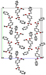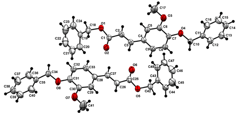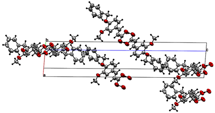 Figure 8 shows the molecular structure of compound 6. There are two independent molecules 4 in the crystal. Molecule 6 contains three substituents mainly at C4 a methoxyphenyl acrylate moiety; at C6 a methoxy group and C7 a benzoyloxy moiety. The dihedral angles between phenyl rings C11-C16 and C19-C24 with the central phenyl ring C4-C9 are 70.50 (12) and 69.61 (14), respectively. The dihedral angles between phenyl rings C35-C40 and C43-C48 with the central phenyl ring C28-C33 are 77.00 (14) and 73.92 (16), respectively. The dihedral angle between the phenyl rings C4-C9 and C28-C33 is only 4.76 (12)˚. There are seven C-H…O interactions linked the two independent molecules in the crystal packed at normal van der Waals distances (Figure 9).