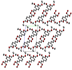 The molecular structure of 4 corresponds to a new benzoyloxy and acrylate derivative of ferulic acid. There are no significant molecular distortions in terms of bond lengths and angles. The dihedral angles between benzene ring C4 to C9 and the side chains at C4 and C7 are 21.25 (5) and 8.84 (5)˚, respectively. However, the benzene ring C4 to C9 makes and angle of 86.00 (5)˚ with the benzene ring C11 to C16. The molecule 4 in the crystal are linked by one C-H…O intermolecular interaction involving an H atom of the phenyl ring C4-C9 and carbonyl oxygen of the acrylate group. This interaction linked the molecules in the crystal and packed at normal van der Waals distances (Figure 9).