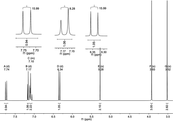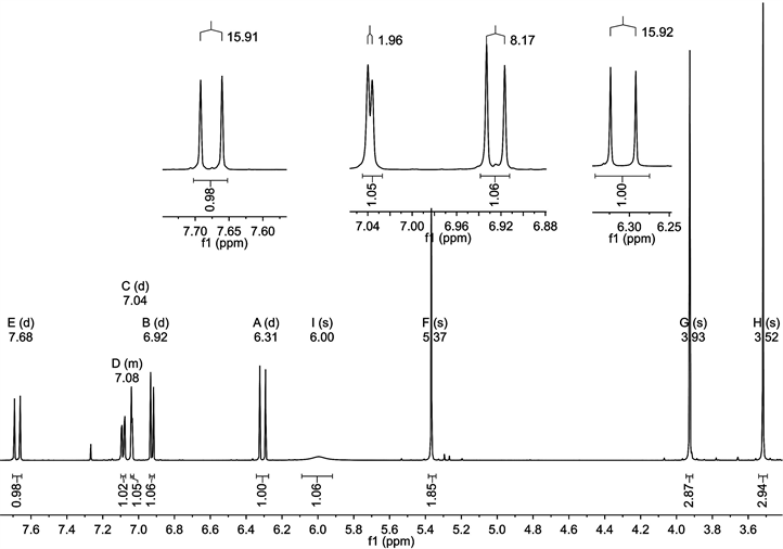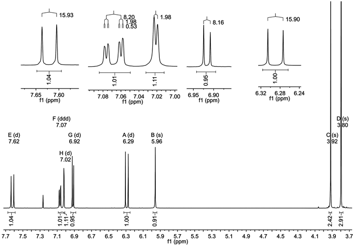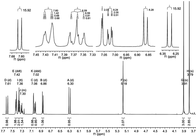 Methoxymethyl (E)-3-(4-hydroxy-3-methoxyphenyl)acrylate (2). To a solution of 1.0 meq of FA (0.1940 g) in 30 ml of CH2Cl2, 1.1 meq of triethylamine and 1.1 meq of chloromethyl methyl ether (Cl-MOM) were added. The reaction mixture was stirred at room temperature until the disappearance of the starting material was observed by TLC (Hexane:EtOAc: 70:30). The reaction was quenched by evaporation of the solvents of reaction and the mixture was extracted with EtOAc (3 × 20 mL), yield 68%, mp 80˚C. 1H NMR (500 MHz, chloroform-d); δ 7.68 (d, J = 15.9 Hz, 1H), 7.08 (m, 1H), 7.04 (d, J = 2.0 Hz, 1H), 6.92 (d, J = 8.2 Hz, 1H), 6.31 (d, J = 15.9 Hz, 1H), 6.00 (s, 1H), 5.37 (s, 2H), 3.93 (s, 3H), 3.52 (s, 3H) spectrum is shown in Figure 2. 13C NMR (125 MHz, chloroform-d) δ 166.59, 148.18, 146.80, 145.78, 126.76, 123.19, 114.86, 114.76, 109.44, 90.35, 57.55, 55.90. IR; 3266.48, 2944.22, 1716.75, 1627.83, 1508.79 cm−1. MS [238+].