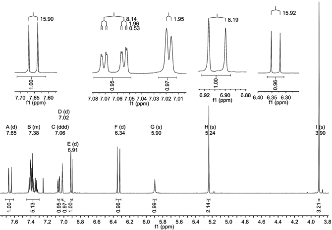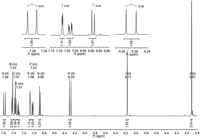 Benzyl (E)-3-(4-hydroxy-3-methoxyphenyl)acrylate (5). To a solution of 1.0 meq of FA (0.1940 g) in 30 ml of CH2Cl2 1.1 meq of triethylamine 1.1 meq of benzyl bromide were added. The reaction mixture was stirred at room temperature and followed by TLC (Hexane:EtOAc: 70:30). After removal of solvent reaction was partitioned with EtOAc (3 × 20 mL) and H2O, the combined extracts were dried over anhydrous Na2SO4, filtered, and the solvent was removed in vacuum, yield 73%, mp 57.3˚C. 1H NMR (500 MHz, chloroform-d) δ 7.65 (d, J = 15.9 Hz, 1H), 7.38 (m, 5H), 7.06(ddd, J = 8.1, 2.0, 0.5 Hz, 1H), 7.02 (d, J = 2 Hz, 1H) 6.91 (d, J = 8.2 Hz, 1H), 6.34 (d, J = 15.9 Hz, 1H), 5.90 (s, 1H), 5.24 (s, 2H), 3.90 (s, 3H) spectrum is shown in Figure 5. 13C NMR (125 MHz, chloroform-d) δ 167.05, 148.03, 146.75, 145.23, 136.17, 128.56, 128.24, 128.19, 126.93, 123.13, 115.22, 114.71, 109.33, 66.22, 55.91, IR; 3404.3, 2941.23, 1703.49, 1632.44, 1593.13, 1514.53 cm−1, MS [286+].