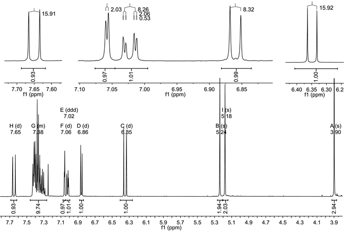 Benzyl (E)-3-(4-(benzyloxy)-3-methoxyphenyl)acrylate (6). 1 meq of compound 5 was solved in 30 mL of acetone anhydrous and was added 1 meq of K2CO3 and finally was added 1.1 meq of benzyl bromide. The reaction mixture was stirred at room temperature until the disappearance of the starting material was observed by TLC (Hexane:EtOAc: 70:30). The reaction was quenched by filtration of potassium salts and the solvent was removed in vacuum, yield 84%, mp 86.3˚C. 1H NMR (500 MHz, chloroform-d); δ 7.65 (d, J = 15.9 Hz, 1H), 7.45 - 7.27 (m, 10H), 7.06 (d, J = 2.0 Hz, 1H), 7.02 (ddd, J = 8.3, 2.1, 0.5 Hz, 1H), 6.86 (d, J = 8.3 Hz, 1H), 6.35 (d, J = 15.9 Hz, 1H), 5.24 (s, 2H), 5.18 (s, 2H), 3.90 (s, 3H) spectrum is shown in Figure 6. 13C NMR (125 MHz, chloroform-d) δ 166.97, 150.32, 149.76, 145.62, 145.03, 136.56, 136.16, 128.61, 128.57, 128.24, 128.19, 128.00, 127.70, 127.18, 122.44, 115.67, 113.43, 110.22, 70.85, 66.23, 55.96, IR; 2937.39, 1697.95, 1628.78, 1505.19, 1255.53, 1157.91, 1135.79 cm−1, MS [molecular ion not observed].