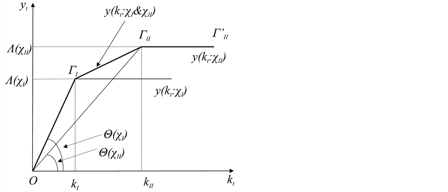 Figure 2 describes the production functions in equilibrium with the two thresholds, and . When , we have the Leontief production function, represented as , in which the optimal output/capital ratio and output per capita are represented as and , respectively. When , mechanization begins. The Leontief production function slides northeasterly, which is represented as in the periods of . Depending on the capital/labor ratio of a firm, the firm gradually adopts the new mechanized technique. The process of mechanization, which shows the transition from the old technique, , to the new mechanized technique, , appears on the line between and . Finally, when , we have the Leontief production function, represented as , in which the optimal output/capital ratio and output per capita are represented as and , respectively.