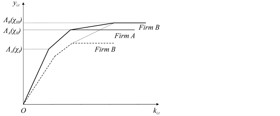 Given (13), the efficient frontier is formed by firm . The production and mechanization of firm are represented below the frontier (see Figure 3). Depending on and ( , ), firms have different timings of mechanization. If a relative decrease in the aggregate capital use to aggregate labor use is smaller for firm than for firm , firm can have mechanization first, even when it is below the frontier.