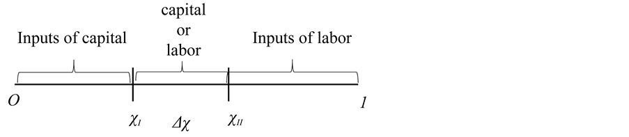 We consider the division of the steps according to the input ranges of labor and capital. As shown in Figure 1, the range of capital use, which is represented by ( ), implies a continuum of production process steps in which capital is the input. Hence, the range of labor use represented by implies a continuum of production process steps for which labor is the input. It is possible to replace labor inputs by capital inputs from to ( ).