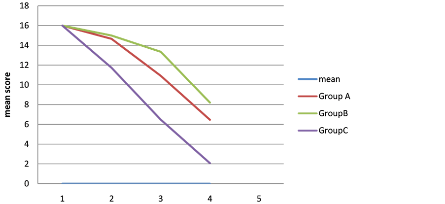 Table 3. The mean and SD of total score within group A, B and C in each visit.