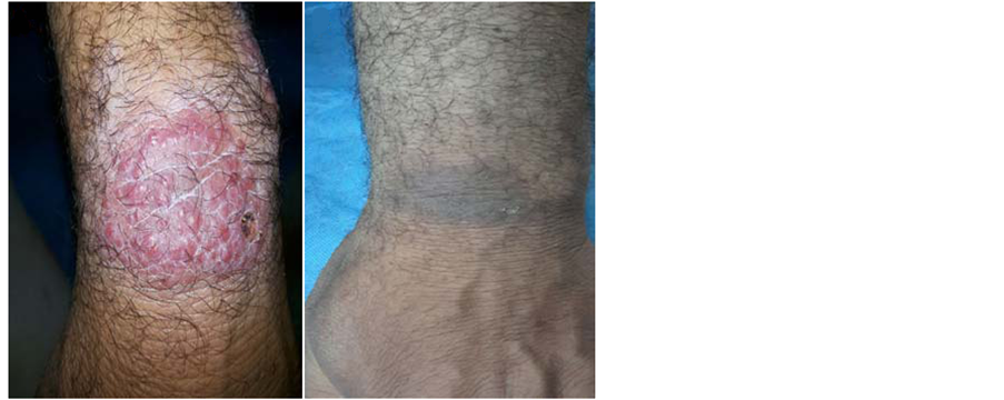 Figure 2. (a) A 45-year-old man with CL before treatment; (b) The same patient after 6 weeks of treatment with (ketoconazole and zinc sulfate).