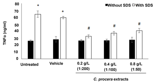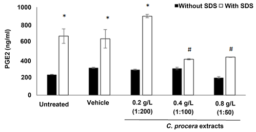 Figure 3. The impact of C. procera extract on SDS-induced irritation. The HSOC pieces were incubated with 10% SDS (vol/vol) to induce irritation. Concomitantly, the explants were treated without or with the indicated concentrations for 48 hr. Then, epidermis viability was measured by MTT assay (a). In addition, TNFα (b), IL-1α (c) and Prostagland in E2 (PGE2) (d) levels in the spent medium were evaluated by ELISA. Values are expressed as means ± SEM and normalized to cell viability. *p < 0.05 for differences from the Vehicle control; #p < 0.05 for differences from the SDS-treated control.