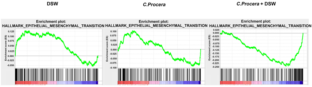 skin gene expression. The effects of these extracts on various biological functional gene sets were analyzed by the GSEA approach. To this end, 0.4 g/L C. procera extract and 5 g/L DSW extract alone or in combination were topically applied on reconstructed full thickness skin tissues. Comparison of the gene profiles of the treatment groups to whole transcriptome GSEA revealed that biological processes pertaining to hypoxia (Figure 4(a)), glycolysis (Figure 4(b)) and epithelial mesenchymal transition (EMT, Figure 4(c)) were enriched. The GSEA analyses further confirmed that those three biological pathways were found to have an opposite direction in the combined treatment group versus treatment with each ingredient as stand-alone. In the treatment group with a combination of C. procera and DSW all three biological pathways were significantly down-regulated (hypoxia FDR = 0, glycolysis FDR = 0.036 and EMT FDR = 0) while in the treatment groups with C. procera or DSW separately, the three biological pathways were up-regulated (hypoxia: FDR = 0.014 for DSW and FDR = 0 for C. procera extract, glycolysis: FDR = 0.021 for DSW and FDR = 0.11 for C. procera extract and EMT FDR = 0.022 for DSW and FDR = 0.077 for C. procera extract).