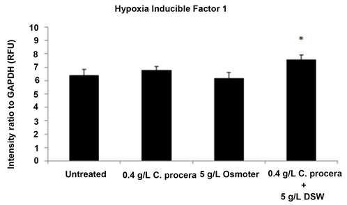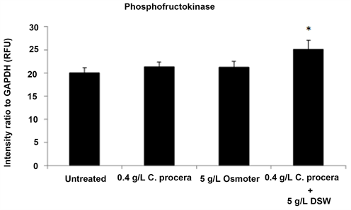 protein/enzymatic biomarkers for each pathway. To investigate the role of hypoxia pathway in human skin under the combined treatment of C. procera extract + DSW, the expression of hypoxia-inducible factor 1 (HIF1) was measured. HIF1 is a ubiquitously expressed heterodimeric transcription factor, which is known to be associated with mammalian cells ability to adapt hypoxia conditions [22] and involved also in skin biological processes, including wound healing and infections. Using immunoblotting approach, a significant increase expression of HIF1 by 15% was observed only after treatment with a combination of C. procera extract + DSW, unlike the untreated skin or skin treated with each of the tested materials alone (Figure 5(a)). Glycolysis pathway was evaluated by the same experimental methodology for the marker Phosphfructokinase-1 (PFK1), a key enzyme involves the hydrolysis of ATP, a critical step in determining glycolytic flux and has been correlated with changes in cellular metabolism and physiology [23] . The results show a significant enhancement in PFK1 expression by 20% when skin was topically applied with combination of C. procera extract + DSW extract relatively to untreated skin or when treated separately with each of the tested ingredients alone (Figure 5(b)). The ability of C. procera extract and DS water extract to affect EMT physiologic processes was assessed by evaluating the amount of fibronectin secreted to culture medium. Fibronectin is a key master of the extracellular matrix (ECM), forming essential connections between cell surface integrin receptors and structural components of the ECM, enhancing skin cells differentiation, assisting in regeneration and healing [24] . Figure 5(c) indicates that both topical treatment with C. procera extract alone and the mixture of C. procera extract and DSW extract were observed to significantly increase fibronectin production by 22% and 20%, respectively.