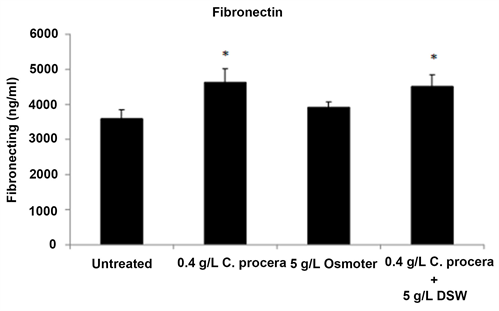 Then, the assay medium was replaced with 5ml of fresh medium (37˚C ± 2˚C) and the tissues were treated topically with 0.4 g/L C. procera extract alone, 5 g/L DSW alone or with the combination of 0.4 g/L C. procera extract and 5 g/L DSW for 48 hours. At the end of the incubation period the surface of the tissues were rinsed with PBS to remove the test materials after which the tissues were homogenized (for RNA/proteins isolations) and the tissue culture media was collected (for ELISA methods).