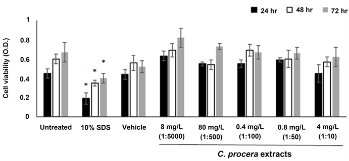 The aim of this experiment was to determine the concentration and time range, where each C. procera extract tolerated by the skin without causing a decrease in epidermis vitality.